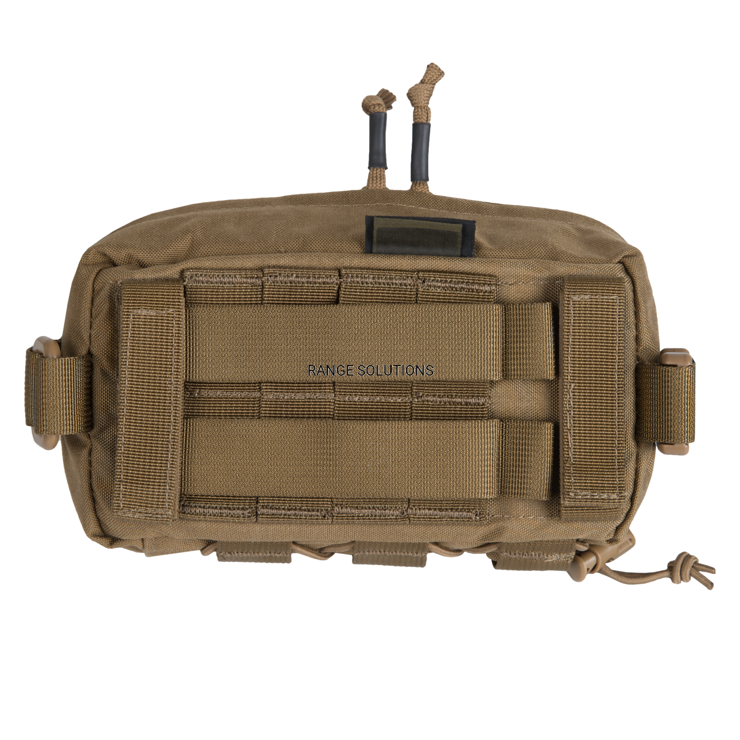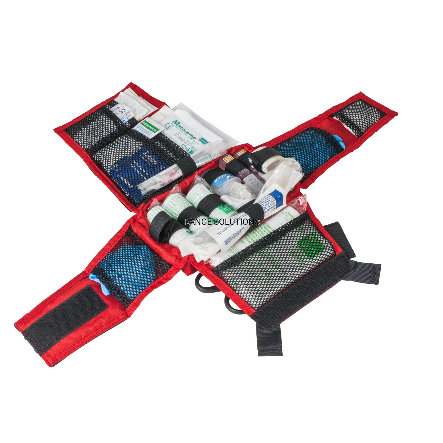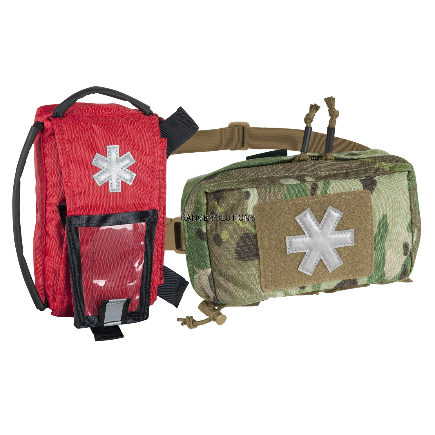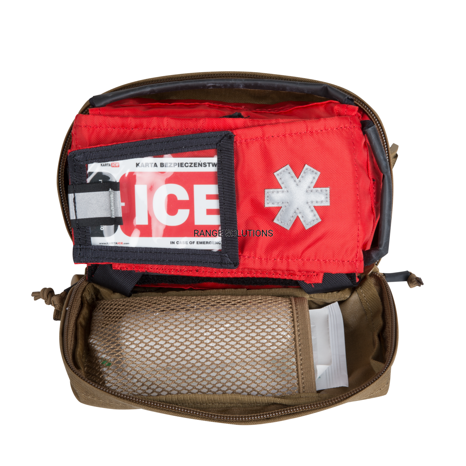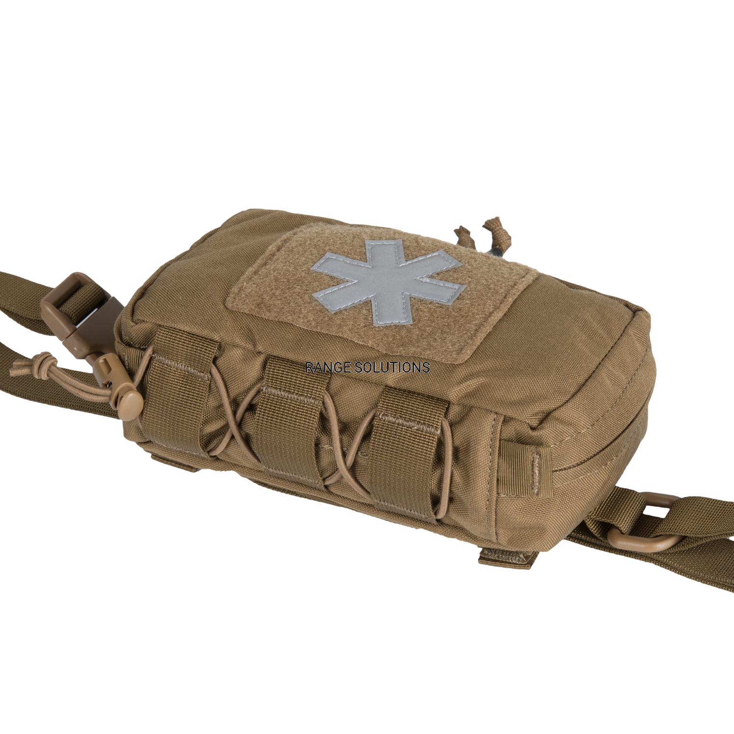 Kieszeń otwiera się rozsuwanym w dwie strony suwakiem. W jej wnętrzu umieściliśmy panel velcro do którego przypina się Wkład, dwie elastyczne pętle z taśmy, dwie pętle z paracordu oraz kieszonkę z siatki zakończoną elastycznym ściągaczem. Pouch dostępny jest w kilku kolorach, posiada zewnętrzy panel velcro z wszytym odblaskowym krzyżem paramedycznym, odpinany pas biodrowy oraz w dolnej części trzy taśmy i elastyczny, ściągany sznurek. Całość zgodna jest z systemem MOLLE/PALS.