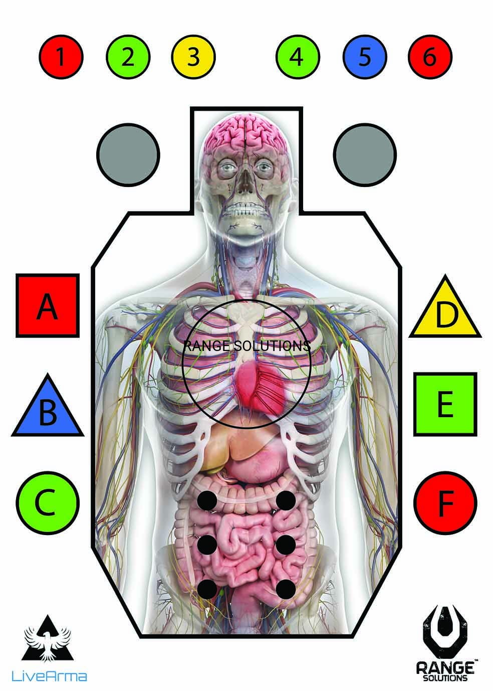 Na tarczy strzelniczej Live Arma znajdziemy obrys tarczy IDPA, w którą została wpisana sylwetka z organami znana z innej tarczy Range Solutions - Pegi18