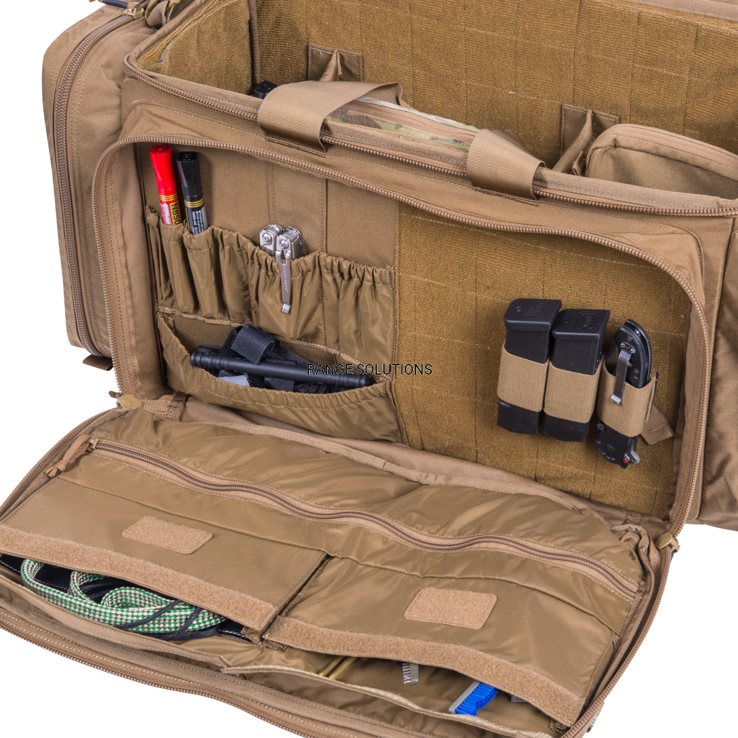 Torba Rangemaster Gear Bag® stworzona została z myślą o osobach pracujących na strzelnicy, entuzjastach strzelectwa i każdej innej osobie która potrzebuje dużej torby do przenoszenia i organizacji wyposażenia na strzelnicę. Torba jest skonstruowana tak aby ułatwić podział i organizację przenoszonego ładunku. Część kieszeni ma wewnętrzne, specjalistyczne organizery na narzędzia i środki do konserwacji broni. W wielu miejscach torbę znajdują się małe panele velcro pozwalające na szybką identyfkację zawartości dzięki zastosowaniu Helikon-Tex® Tag Patch. Wnętrze torby obszyte jest dużymi panelami velcro, pozwalającymi na dowolne konfgurowanie przestrzeni. Torba jest w pełni kompatybilna z Versatle Insert System®, pozwalającym przypinać kabury, ładownice, wkłady medyczne i tym podobne. Całość konstrukcji jest usztywniona i wykonana z niezwykle odpornej na intensywne użytkowanie Cordury®. Szeroki pas nośny - Universal Carrying Strap - oraz usztywniane uchwyty pozwalają na wygodne przenoszenie nawet bardzo ciężkiej torby.